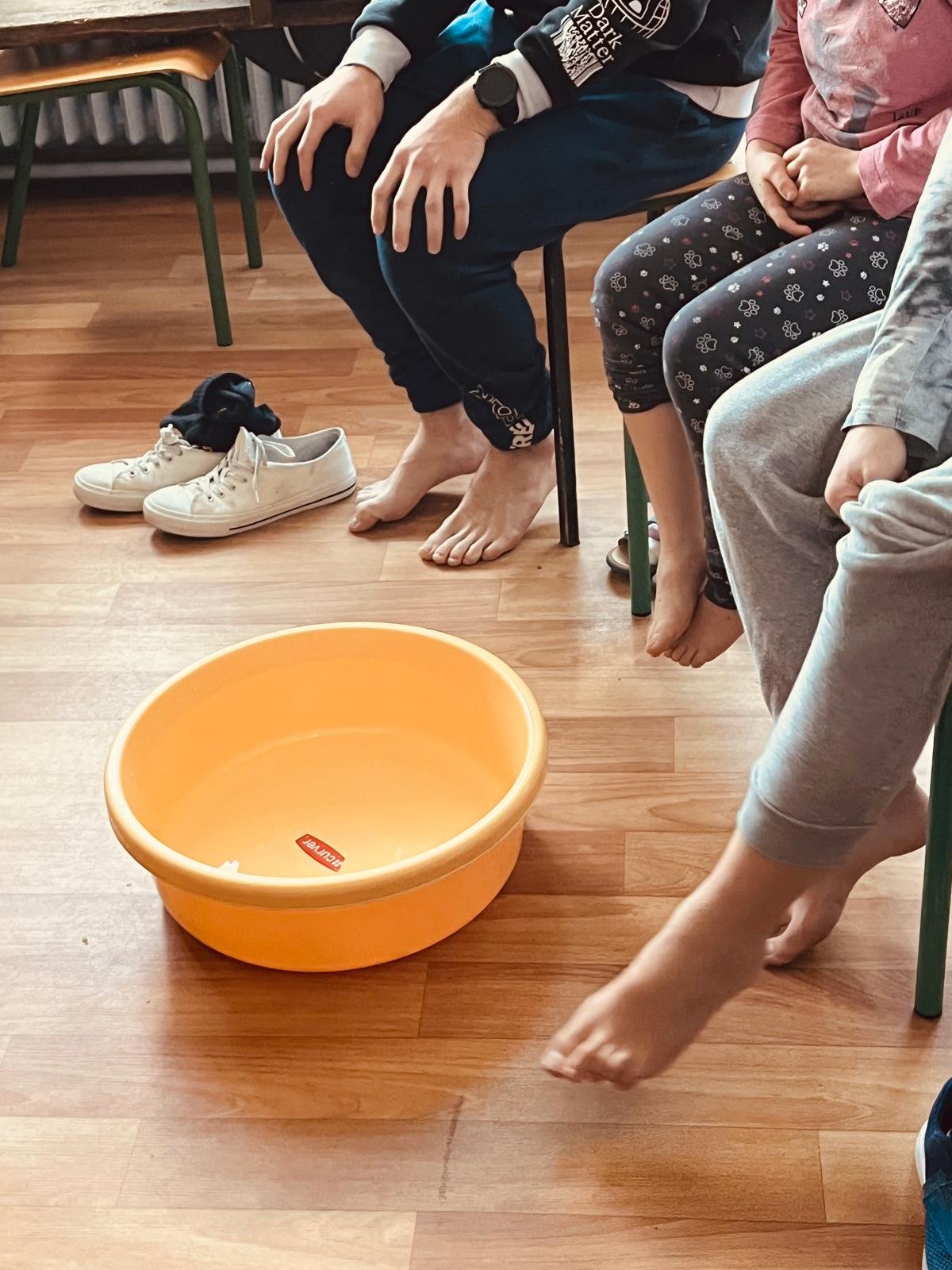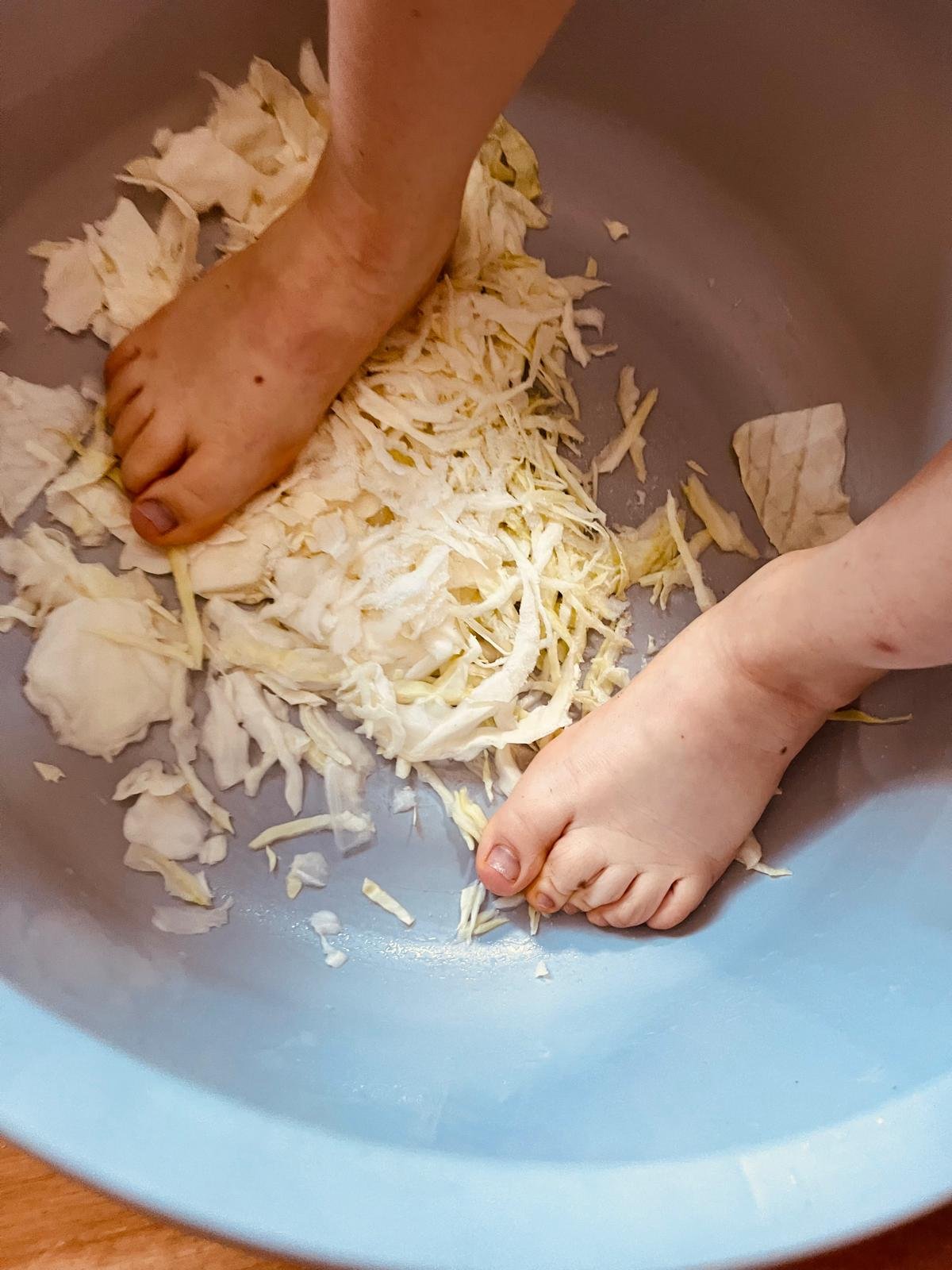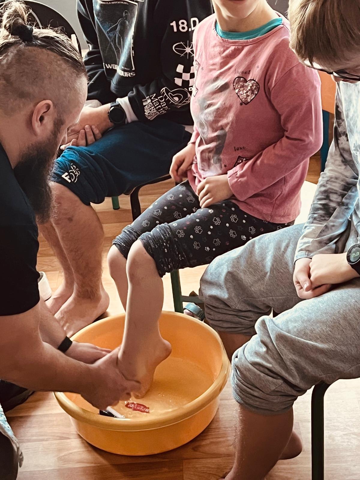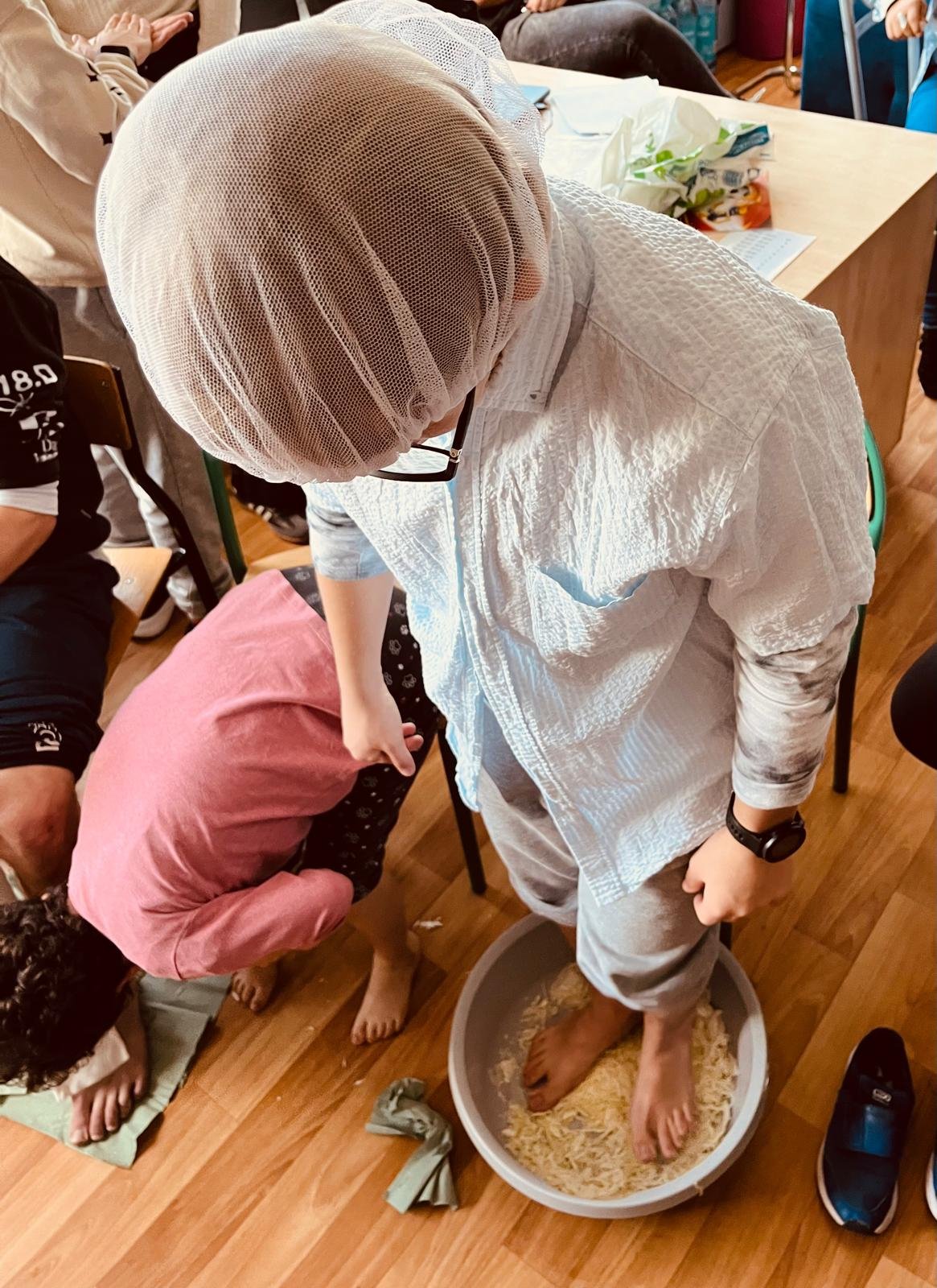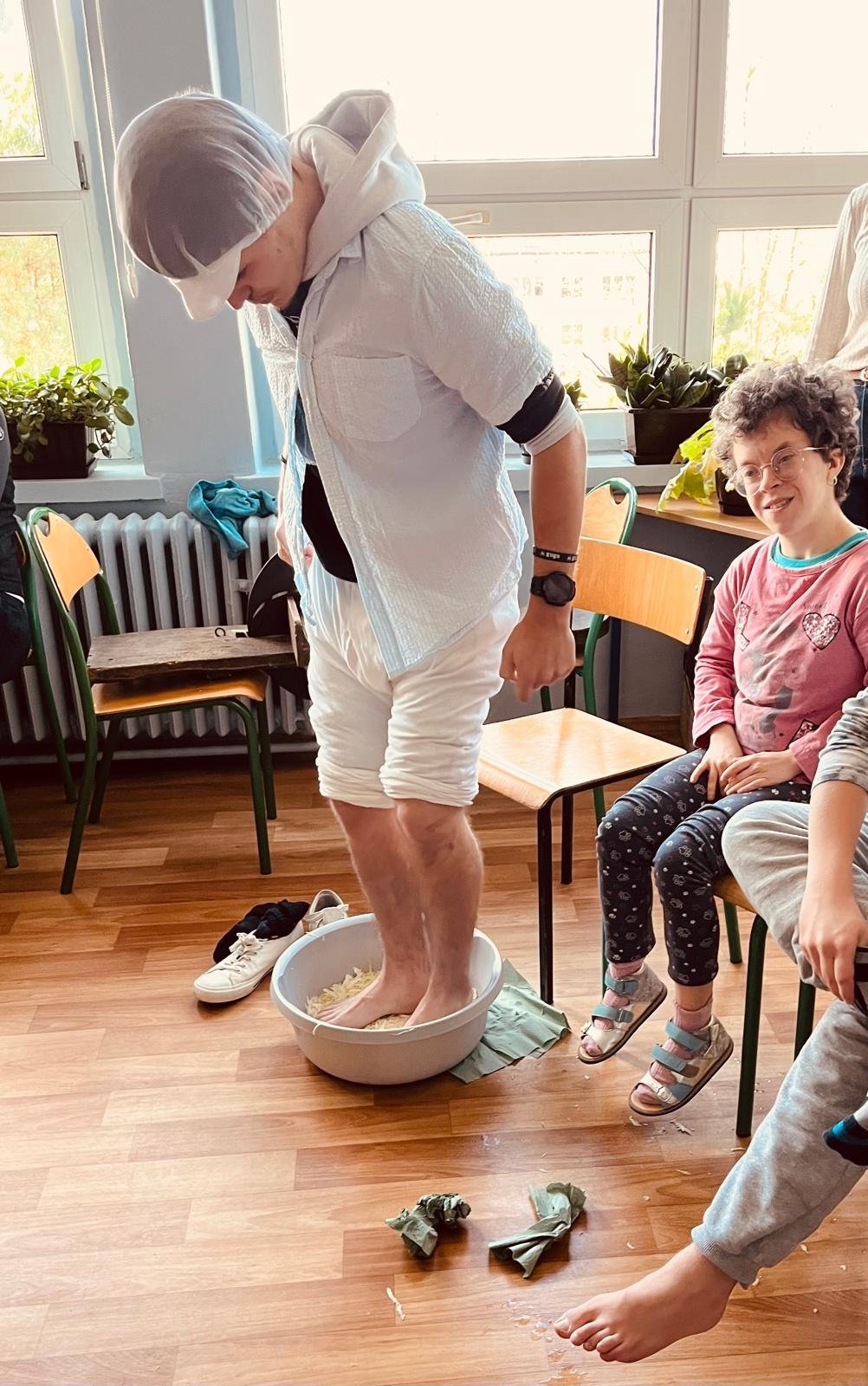 Nie zabrakło też największej atrakcji dnia – deptania kapusty! Trzech odważnych uczniów zgłosiło się do tego zadania. Po dokładnym umyciu stóp i założeniu specjalnych ubrań, z entuzjazmem przystąpili do pracy, deptając kapustę w dużej misce – tak, jak robiono to dawniej.