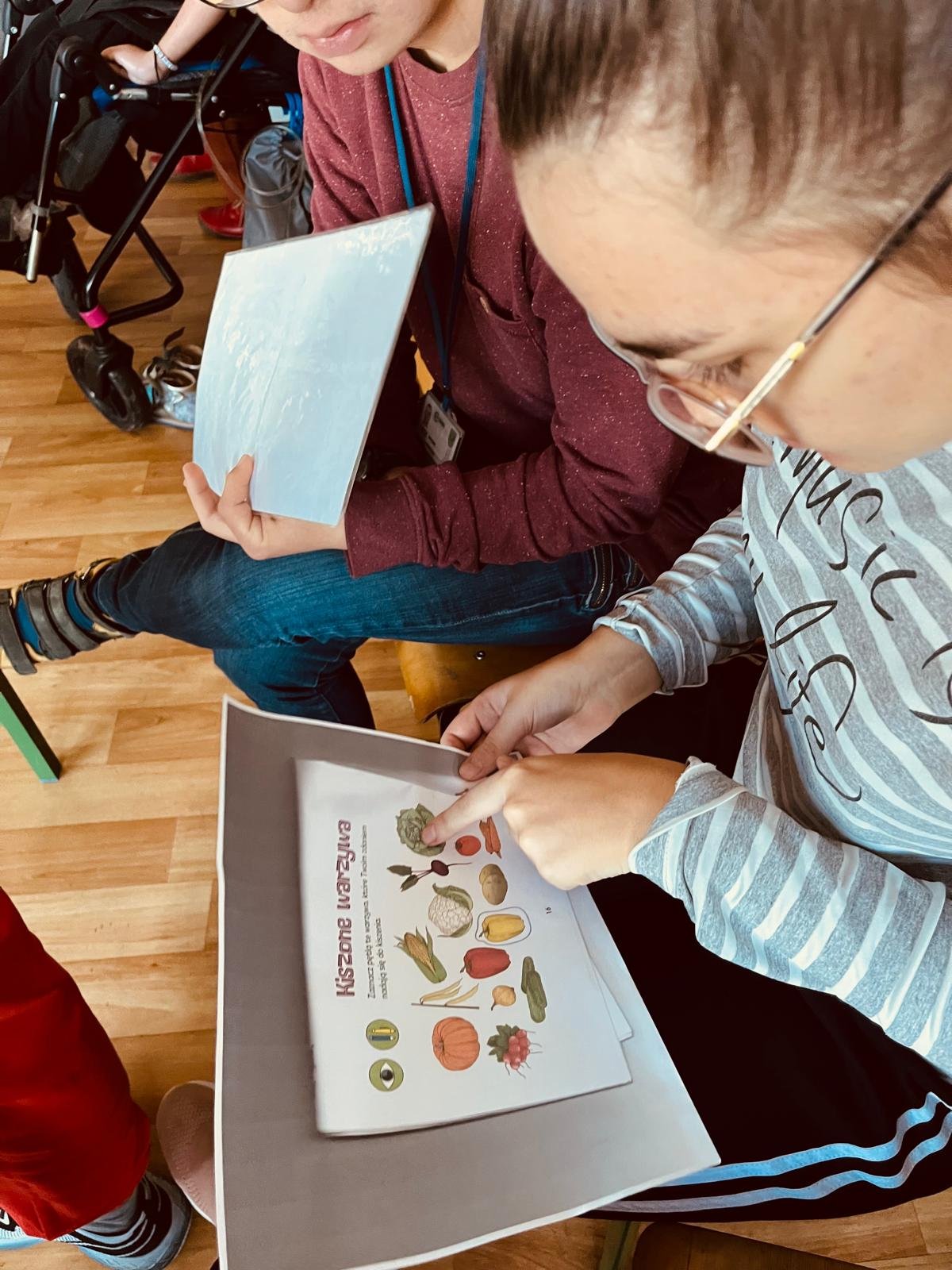 Na początku spotkania wszyscy wysłuchali ciekawego opowiadania o kiszeniu kapusty w języku śląskim, które wprowadziło nas w klimat dawnych czasów. Następnie uczniowie z zaangażowaniem rozwiązywali zagadki o kapuście, wykazując się świetną znajomością tego zdrowego warzywa.
