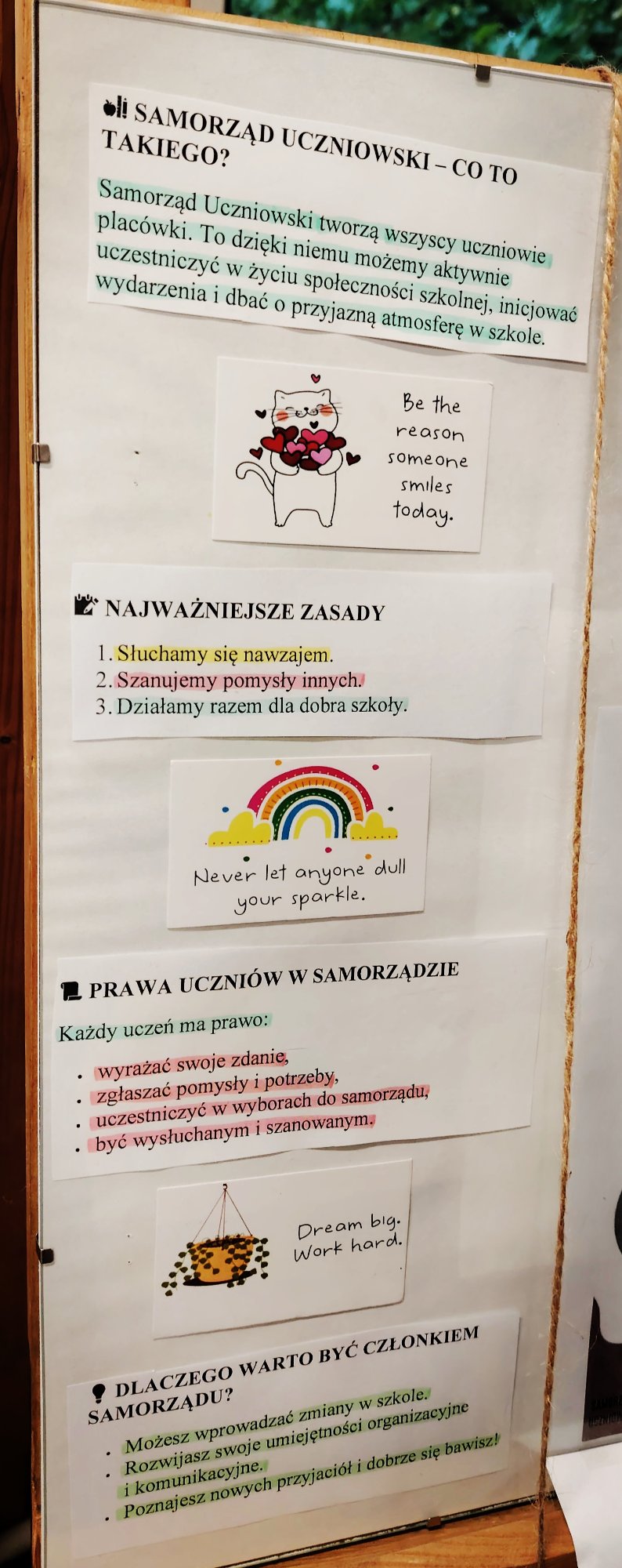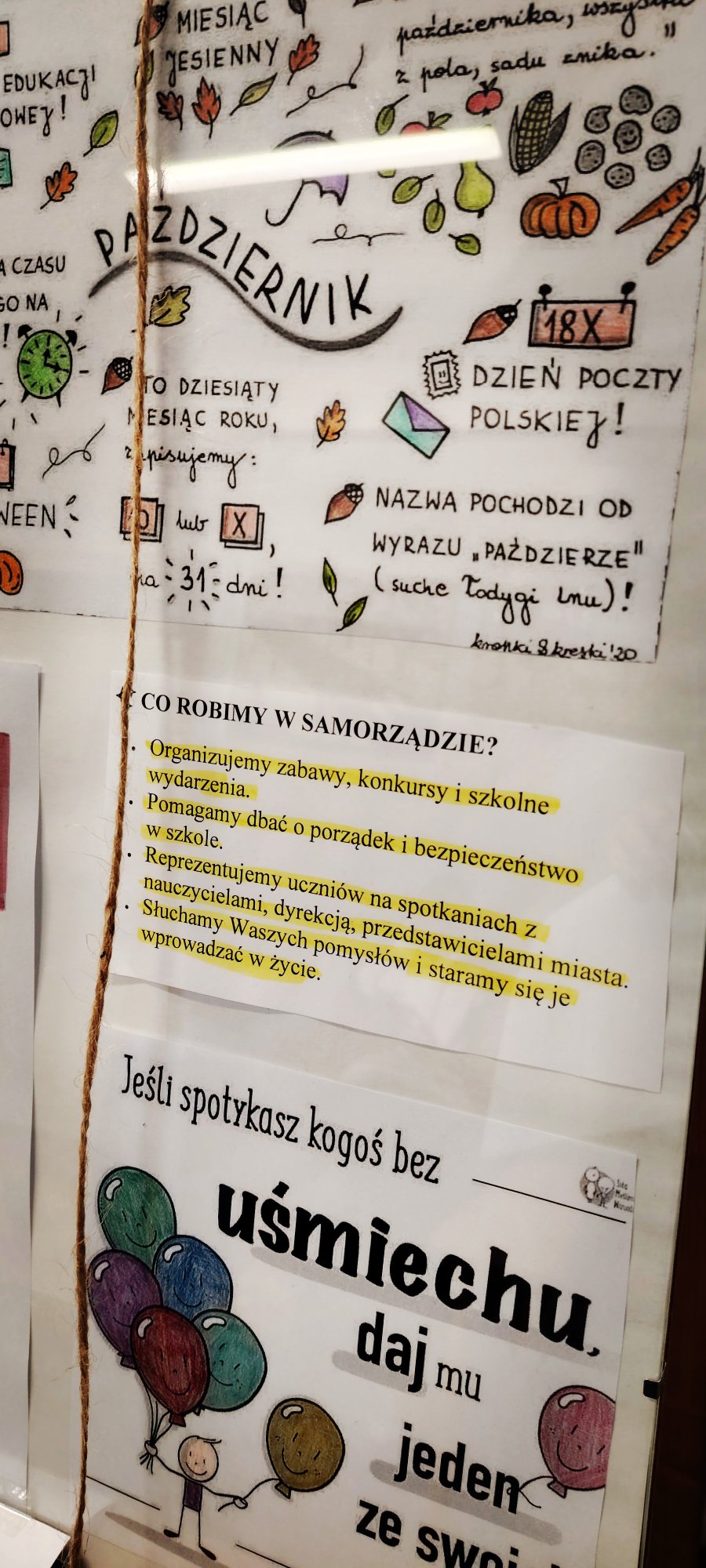 Jednym z pierwszych efektów ich pracy jest gazetka szkolna, którą można znaleźć na korytarzu na piętrze. Znajdują się w niej bieżące informacje z życia szkoły, ciekawostki oraz informacje o tym, czym jest Samorząd Uczniowski, jakie są jego cele i zadania.