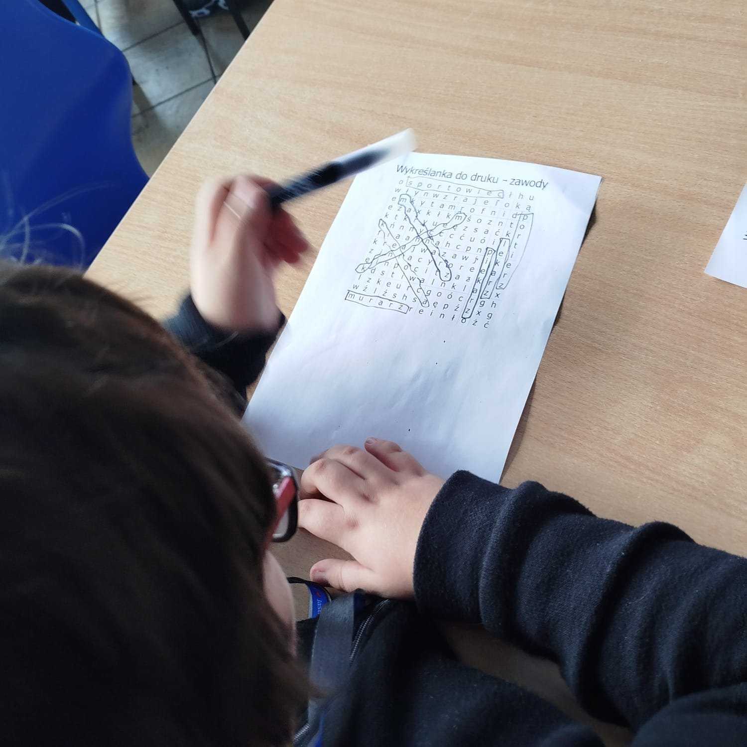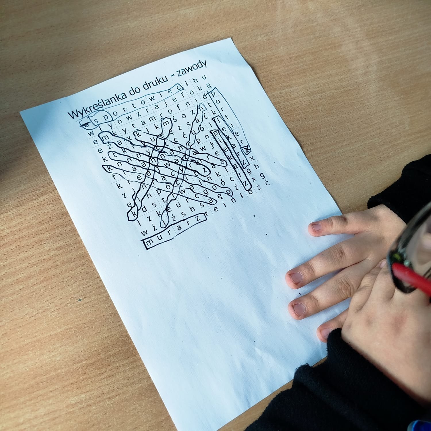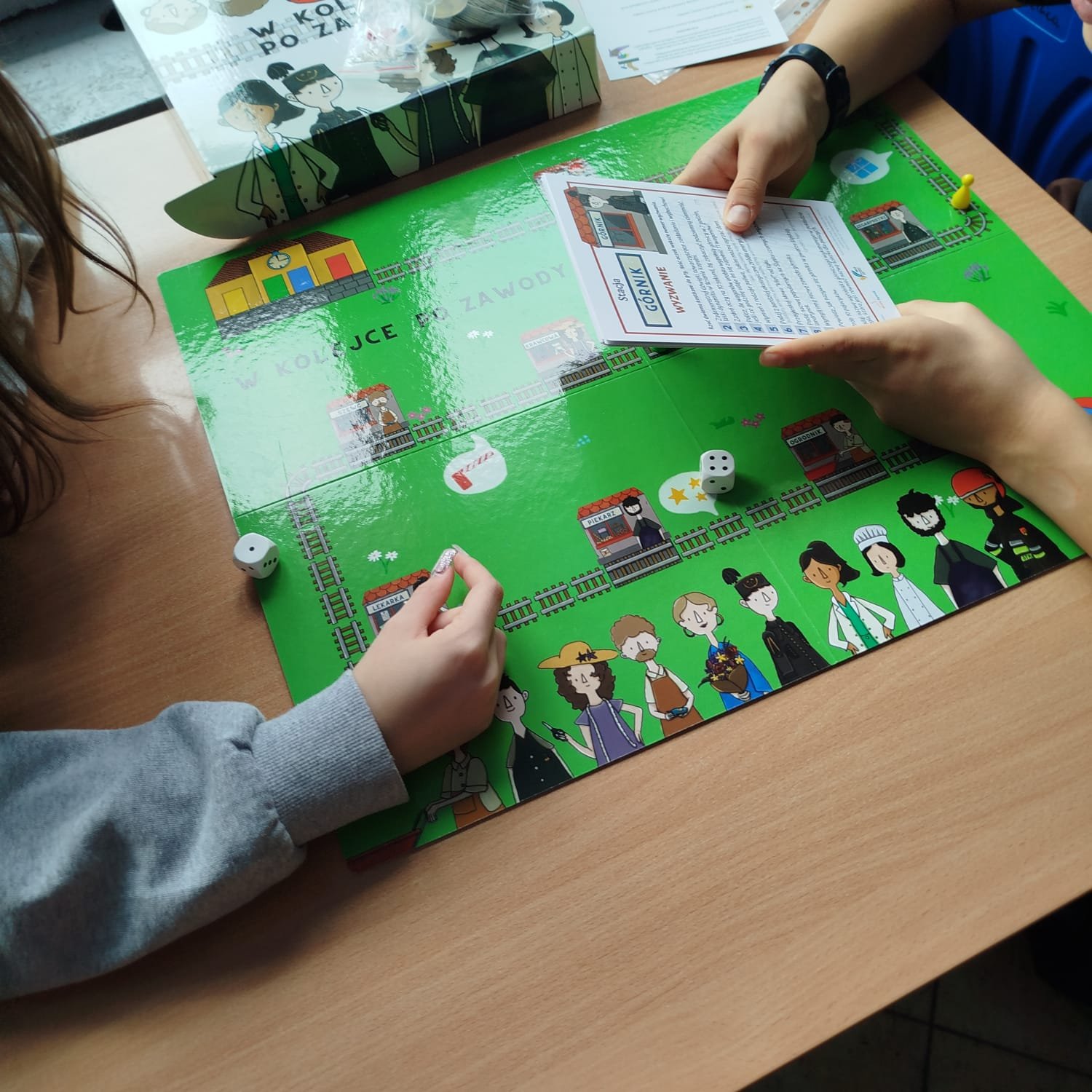 W trakcie warsztatów uczniowie wypełniali łamigłówki w postaci wykreślanek. Doskonałą zabawą były kolorowanki o zawodach. Swoją wiedzą sprawdzili w grze planszowej "W kolejce po zawody."