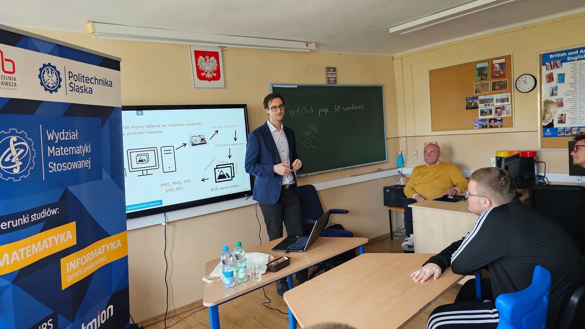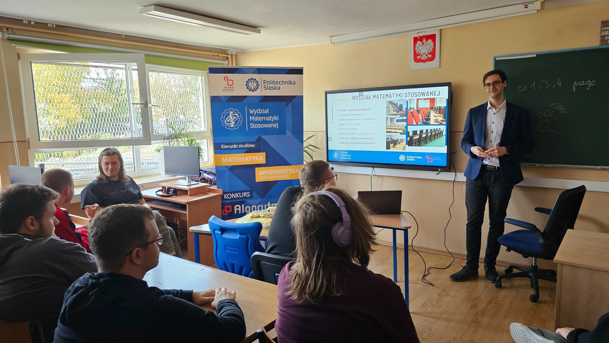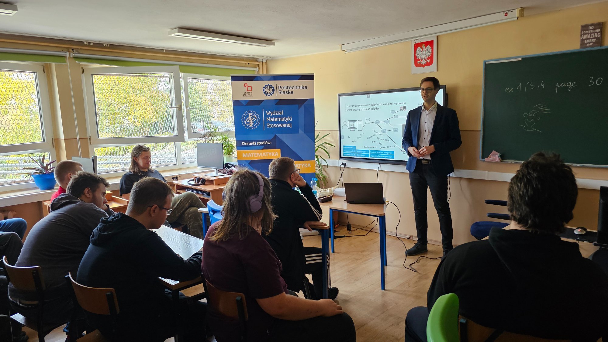 22.10 w ZS 9 pan mgr inż. Mirosław Witkowski / Zespół ds. Promocji Wydziału, Administrator Platformy Zdalnej Edukacji, Administrator Mediów Społecznościowych na Wydziale Matematyki Stosowanej, Administrator stron internetowych na Wydziale Matematyki Stosowanej, Administrator sieci lokalnej/ przekazał uczniom technikum informacje dla kandydatów na wydział matematyki stosowanej, w którym jednym z wiodących kierunków jest informatyka. Zaprezentował uczniom nauczane przedmioty na tym kierunku, możliwość wyjazdów zagranicznych na staże zawodowe oraz koła zainteresowań.