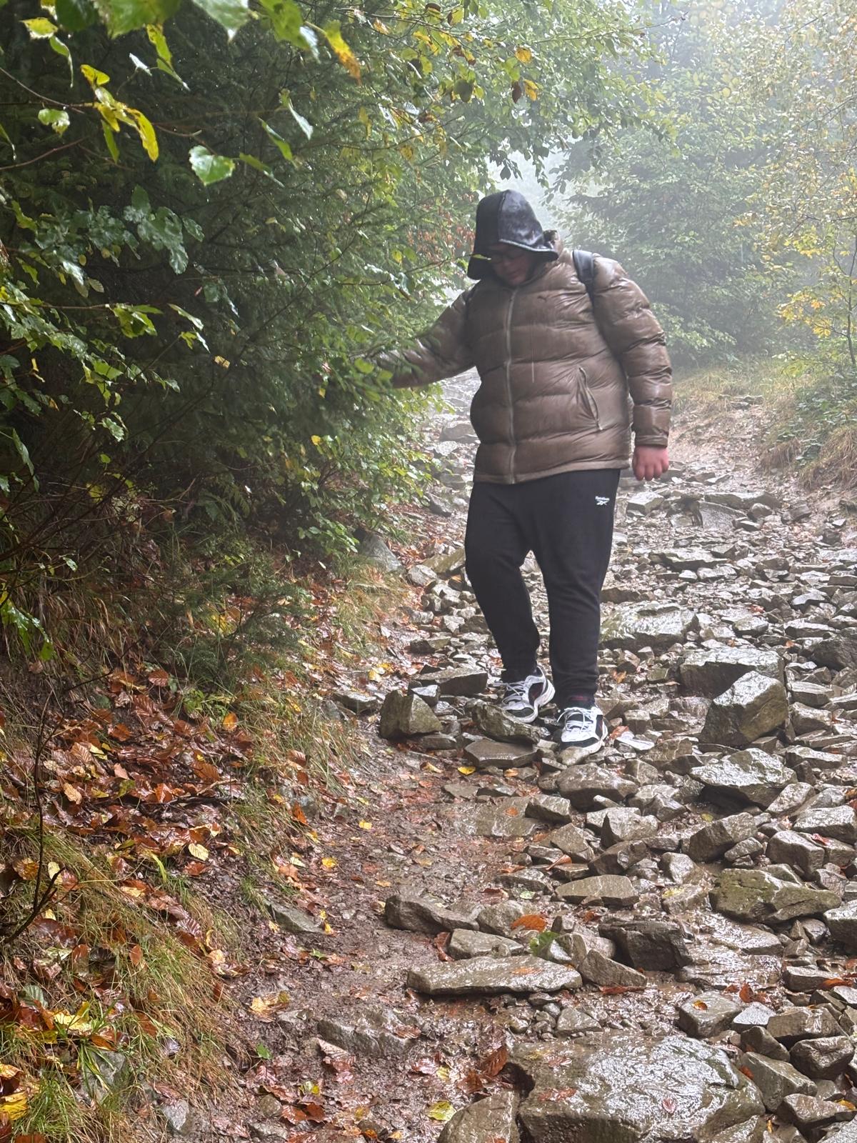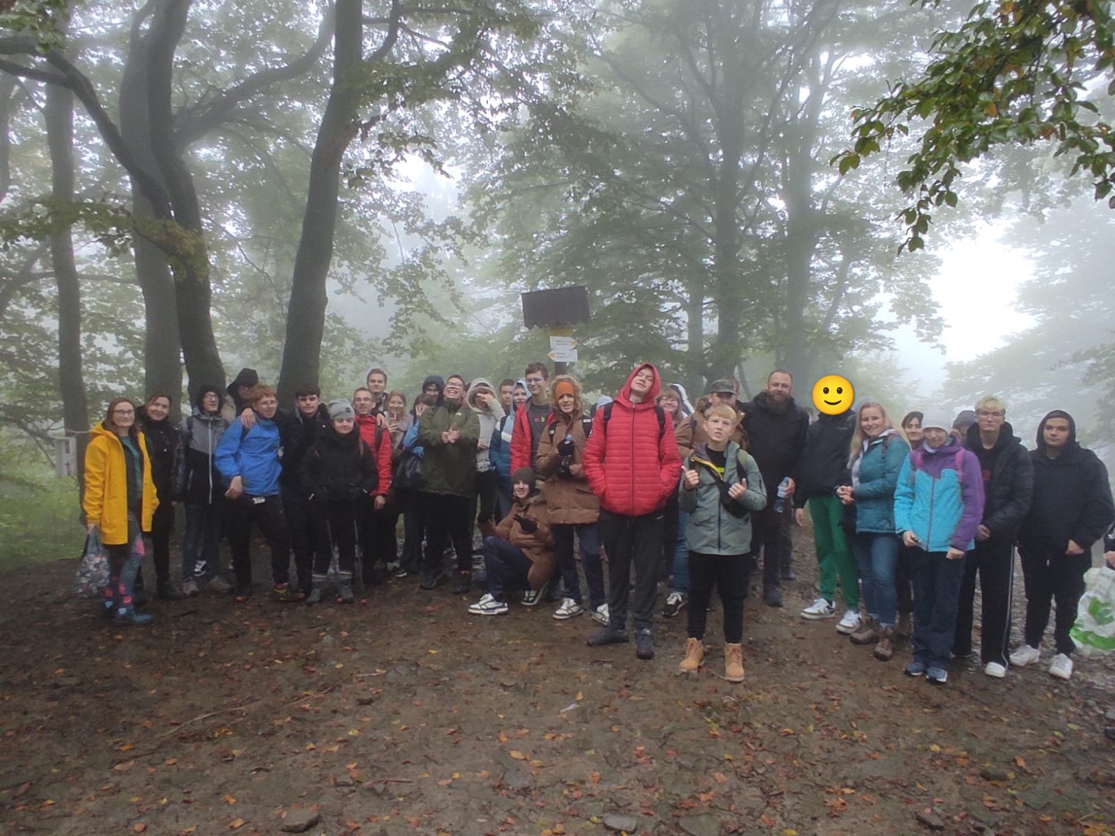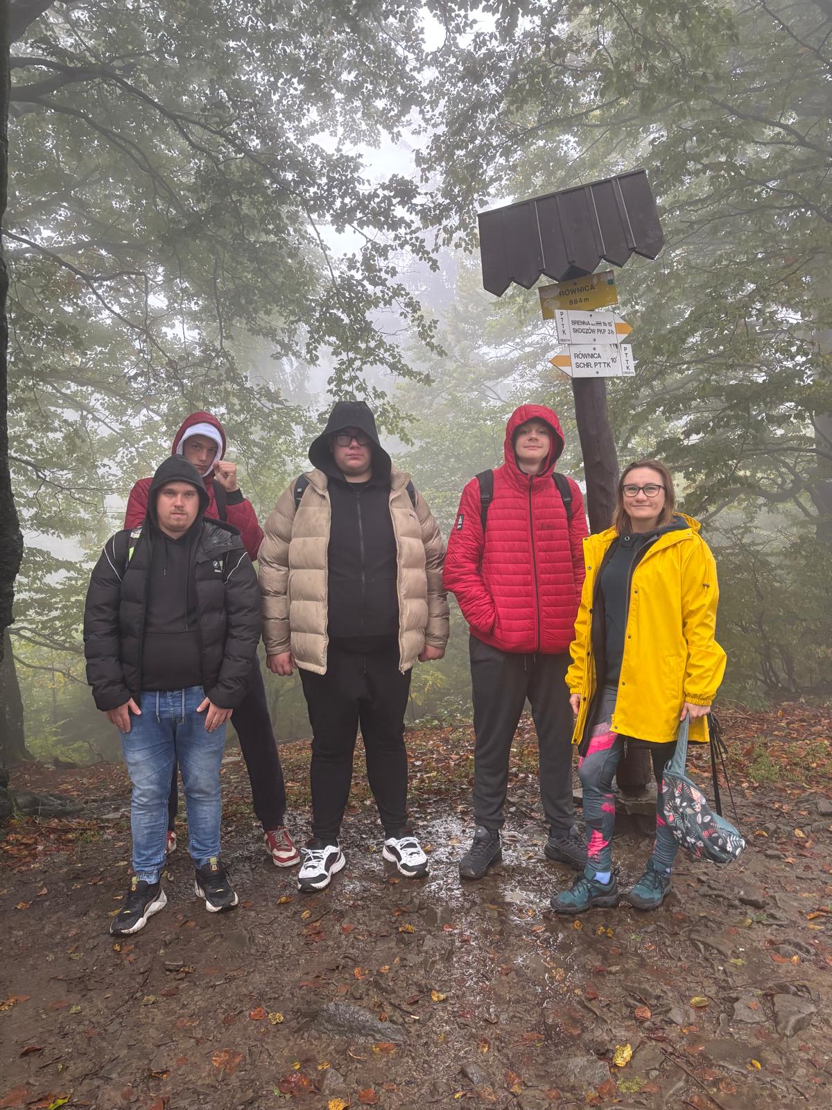 Naszą podróż rozpoczęliśmy od czynności organizacyjno-porządkowych i przekazaniu podstawowych zasad BHP i zachowania się na szlaku. Jeszcze w szkole każdy z uczestników otrzymał pakiet energetyczny (woda, sok owocowy i batonik). Niestety pogoda w tym dniu nie była dla nas łaskawa i z Jastrzębia wyjechaliśmy bez deszczu jednak w momencie dotarcia do Ustronia przywitała nas gęsta mgła, lecz nie przestraszyła nas ta aura i zaczęliśmy wędrówkę żółtym szlakiem w kierunku szczytu. Sceneria na wierzchołku góry była istnie bajkowa najlepiej oddają je zdjęcia poniżej. Po pamiątkowych zdjęciach udaliśmy się z powrotem do wyżej wspomnianego schroniska na przerwę śniadaniową. Po nabraniu sił udaliśmy się w kierunku centrum Ustronia, schodząc czerwonym szlakiem. Padający deszcz, zejście w dół, połączone z mokrymi kamieniami, sprawiło, że trasa nie była łatwa, ale wszyscy szczęśliwie i bezpiecznie dotarli pod autokar, gdzie licznik wskazał 6,85 km. W drodze powrotnej odwiedziliśmy jeden ze stałych punktów wycieczek szkolnych czyli McDonald’s, gdzie każdy z uczestników został obdarowany kanapką i frytkami. Po godzinie 15.00 wróciliśmy do pod szkołę, gdzie nastąpiło rozwiązanie wycieczki.