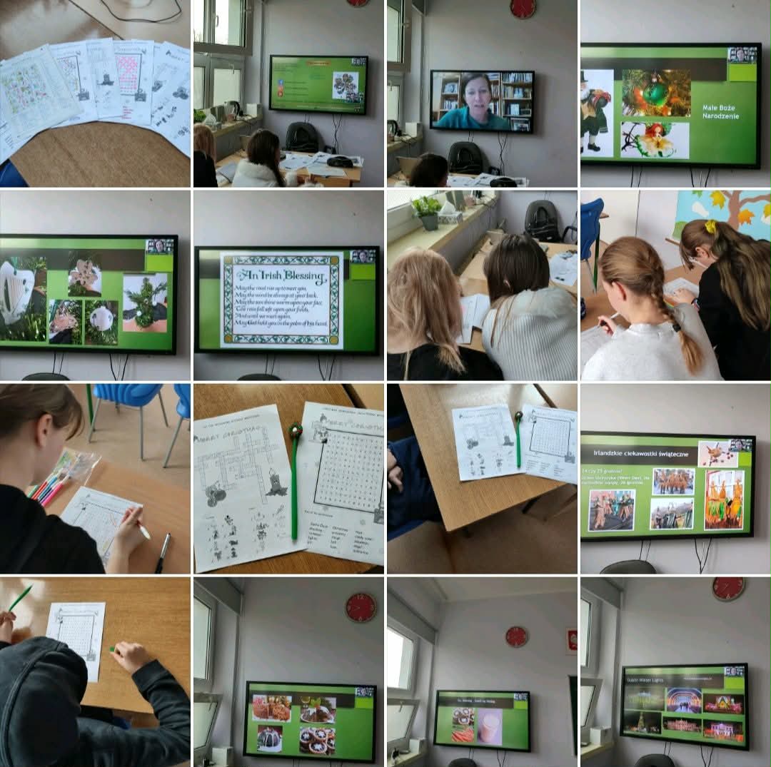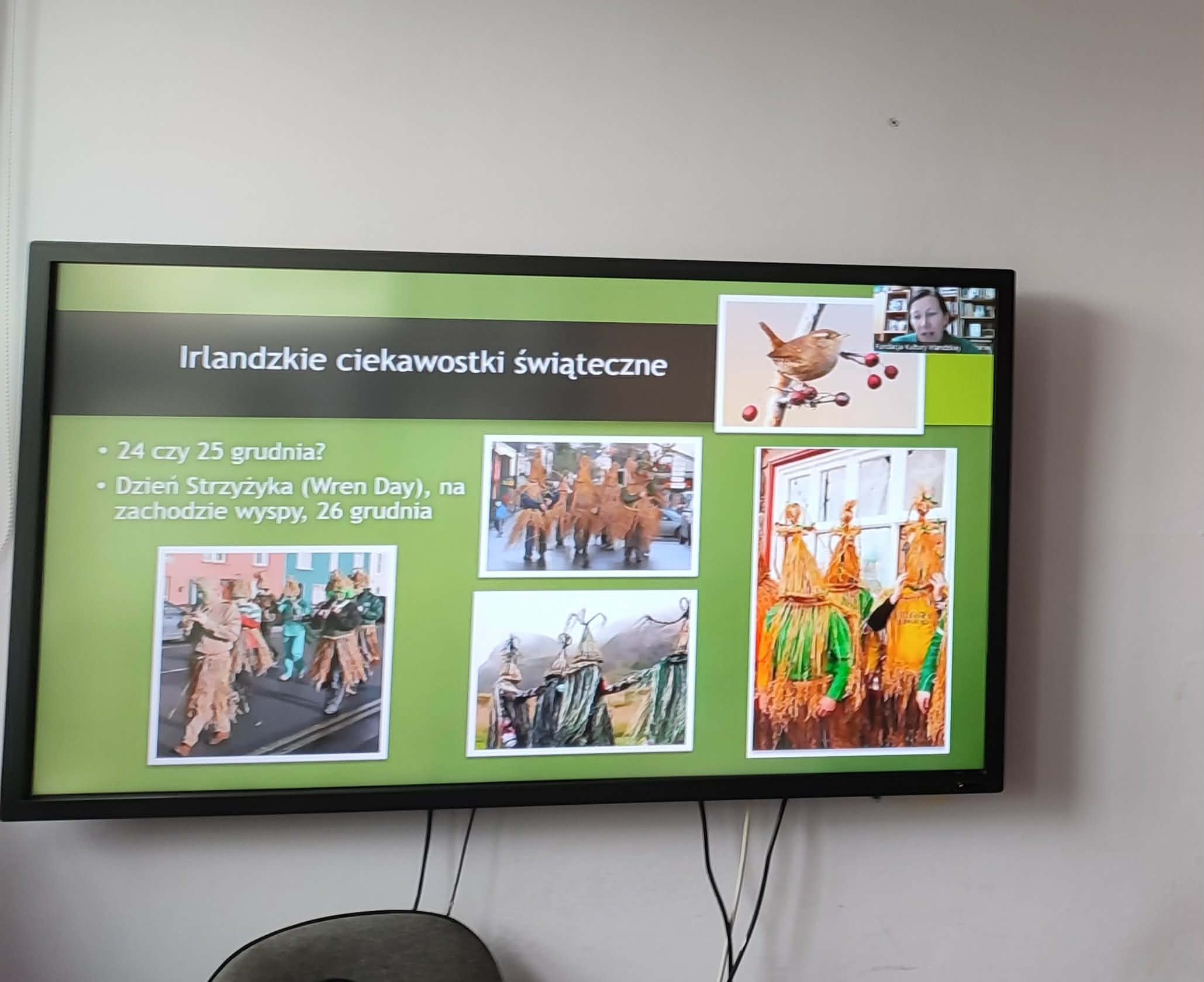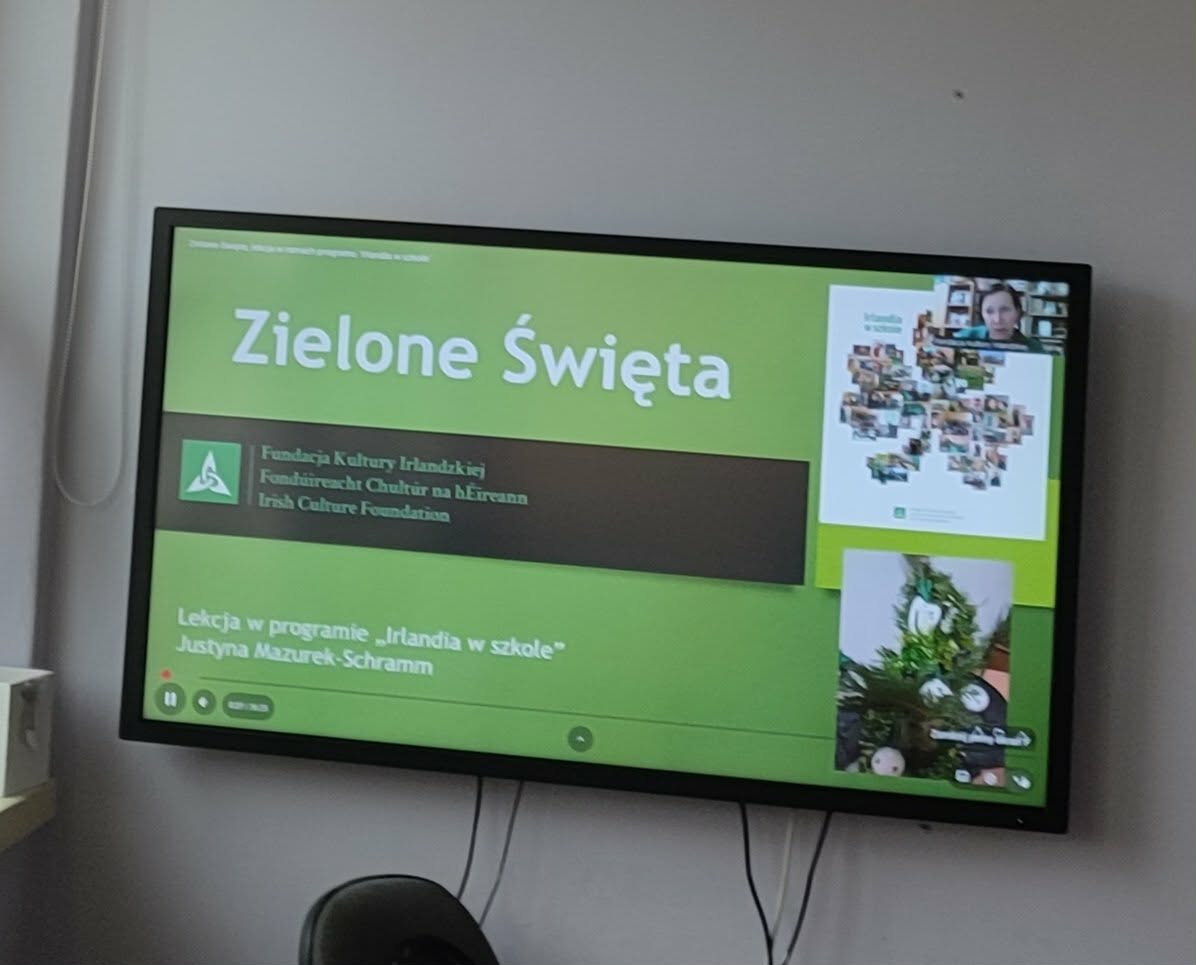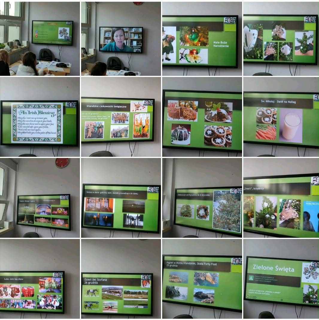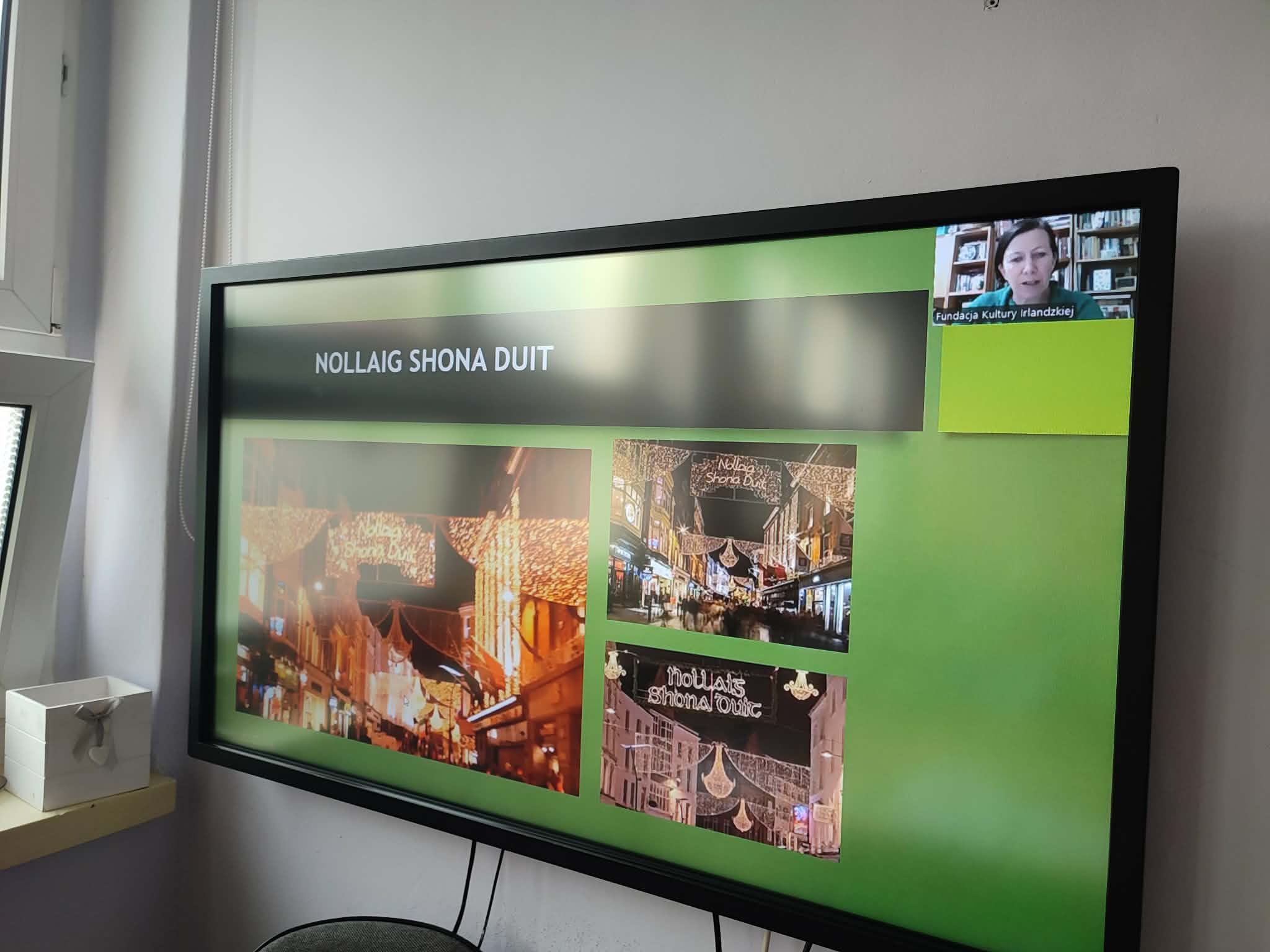 W tym roku z okazji świąt Bożego Narodzenia pani Justyna przygotowała i przedstawiła najważniejsze irlandzkie ciekawostki świąteczne. Uczniowie poznali m.in. w jaki sposób Irlandczycy obchodzą poszczególne świąteczne dni, co jedzą, jaki wystrój mają irlandzkie miasta. Dowiedzieli się również co dostaje Daidi na Nollag, czyli Mikołaj, gdy przynosi prezenty, a także – jaki jest przekaz ulubionego świątecznego programu Irlandczyków „Late, late toy show”. Prezentację zakończyło znane „An Irish Blessing”, czyli irlandzkie błogosławieństwo świąteczne – życzenia wszelkiej pomyślności, radości i spokoju.